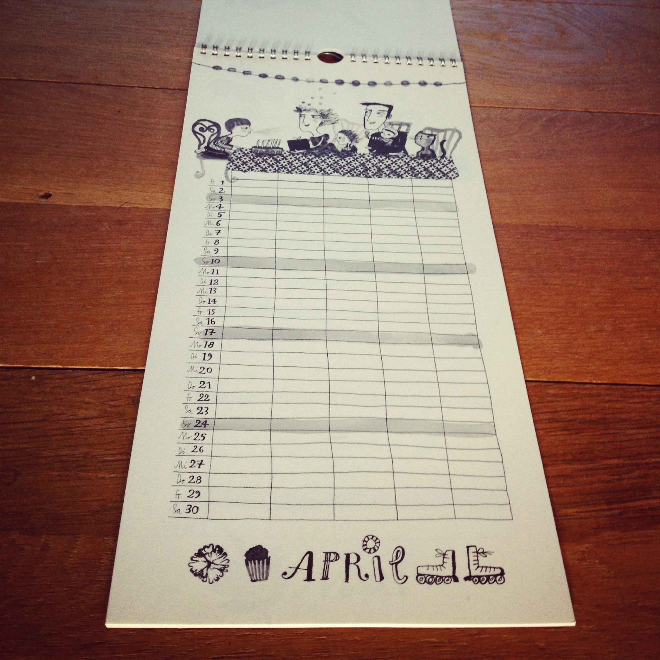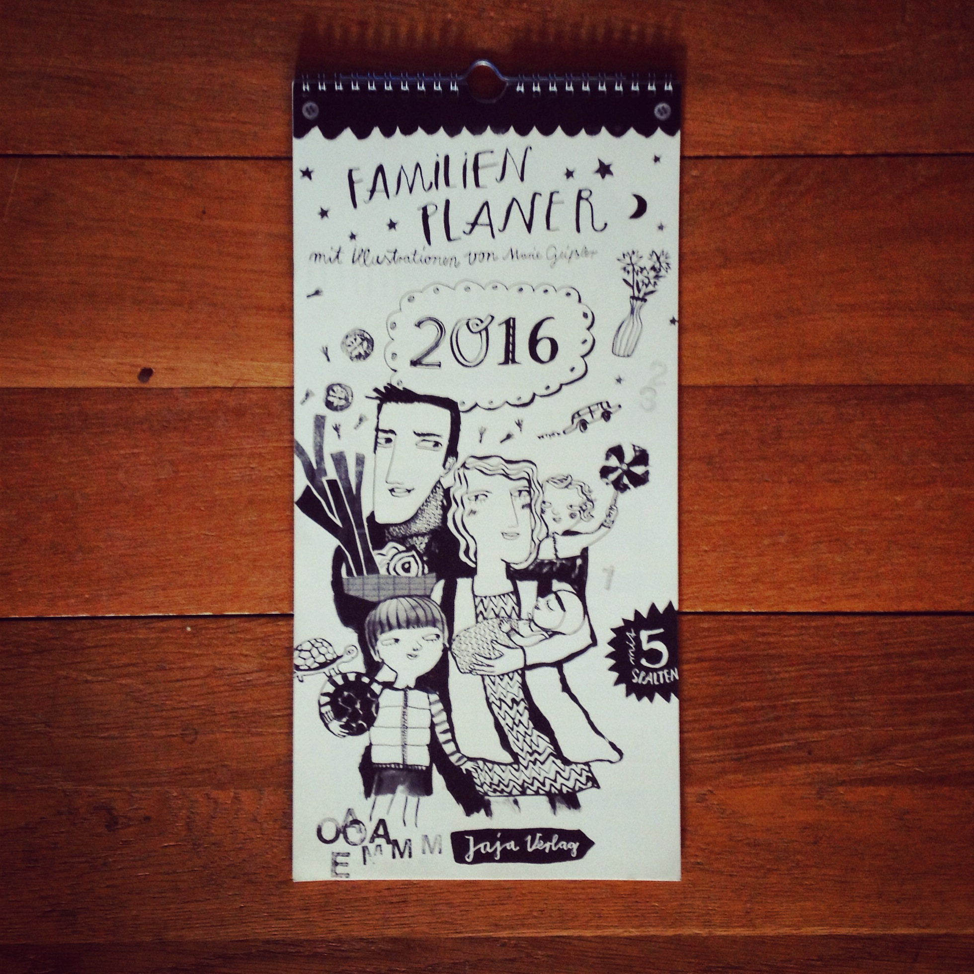 Der Wandkalender „Familienplaner 2016“ von Marie Geißler, erschienen im JaJa Verlag, Format 20 cm x 41 cm, Spiralbindung, 13 Blätter, 12 Euro